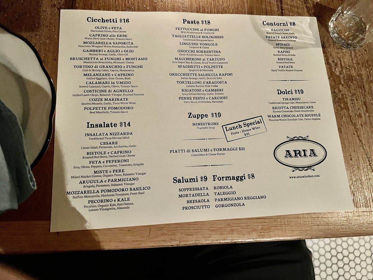 For those with a sweet tooth, Aria’s dessert selection is a must-try, including the decadent Tiramisu and Warm Chocolate Soufflé, both for $11.00. The atmosphere is warm and inviting, perfect for casual dining or special occasions, as echoed by patrons highlighting the exceptional service and delicious offerings.