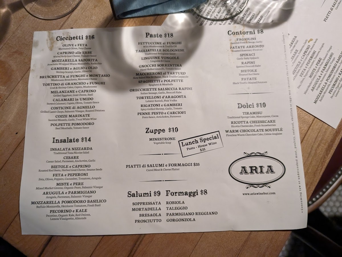 Welcome to Aria Wine Bar, a cozy gem nestled in the heart of New York City at 16 Bedford St. This vibrant establishment offers a delightful culinary experience, expertly blending classic Italian flavors with a modern twist. Their menu is a feast for the senses, featuring salads like the fresh Insalata Nizzarda and the creamy Bietole E Caprino, each priced at a reasonable $15.00.